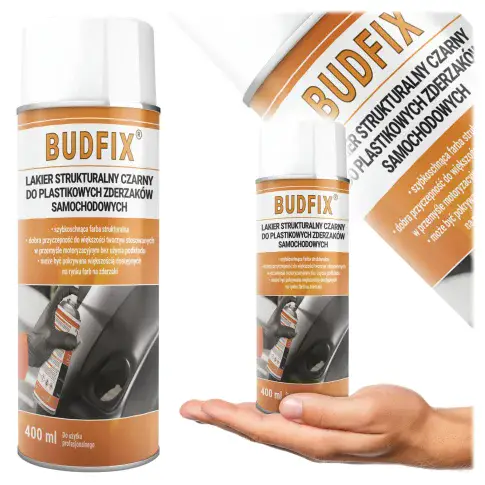 Lakier strukturalny do zderzaków Budfix w kolorze głębokiej czerni to profesjonalny środek do odnawiania elementów z tworzywa sztucznego.