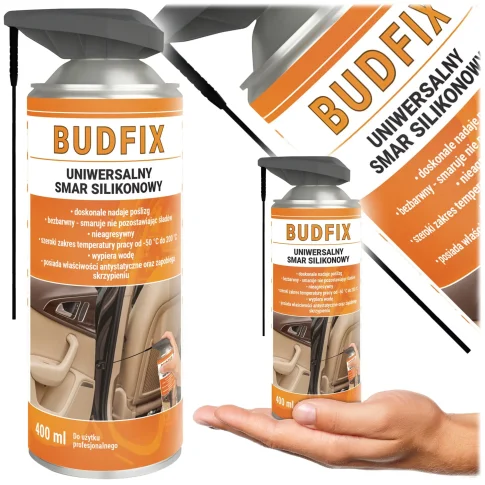 Smar silikonowy Budfix to nasz absolutny bestseller. Jest to w 100% czysty silikon bez domieszek olejów mineralnych, co czyni go bezpiecznym dla każdego rodzaju gumy i plastiku. Wyposażony w smar z aplikatorem (wbudowaną dyszą), pozwala na dotarcie w najtrudniejsze zakamarki bez brudzenia rąk. To niezastąpiony preparat w garażu (szczególnie zimą) oraz w domu.
