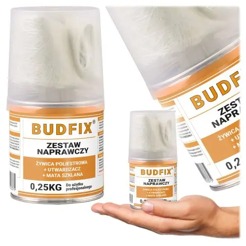 Zestaw naprawczy żywica poliestrowa + utwardzacz + mata szklana do wzmacniania i usztywniania powierzchni metalowych i wykonanych z tworzyw sztucznych 250g
